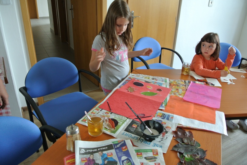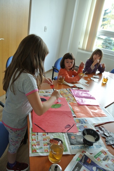 Podzimní řadu výtvarných dílen zahájila Mgr. Tereza Vojtíšková. Účastníci vyráběli papírové desky zdobené podzimně zbarvenými listy stromů.