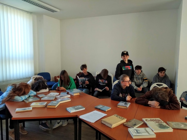 V pondělí 11. dubna navštívili knihovnu žáci 8. ročníku A zdejší ZŠ s paní učitelkou Annou Šimečkovou. Byla pro ně připravena literatura, ve které se autoři zabývají tématem 2. světové války.