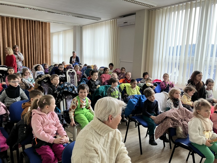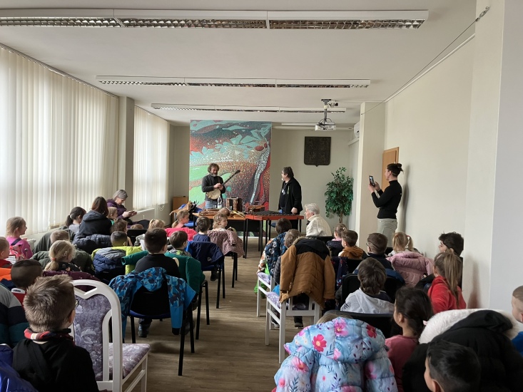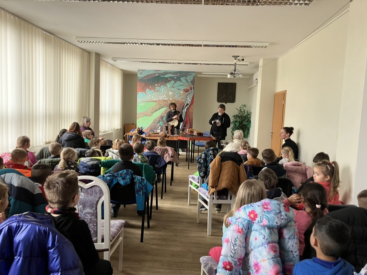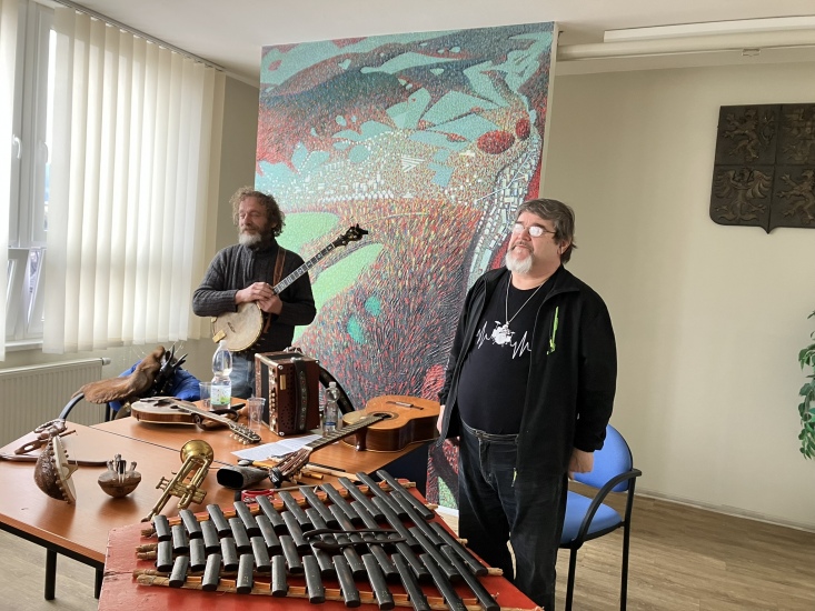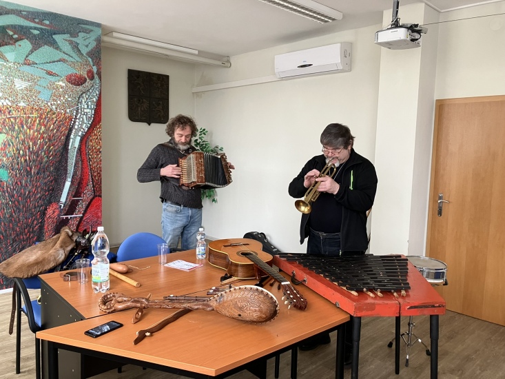 S hudebními nástroji seznamovali děti z MŠ v pátek, 21. února, pánové Josef Palouda a Miloš Solfronk.