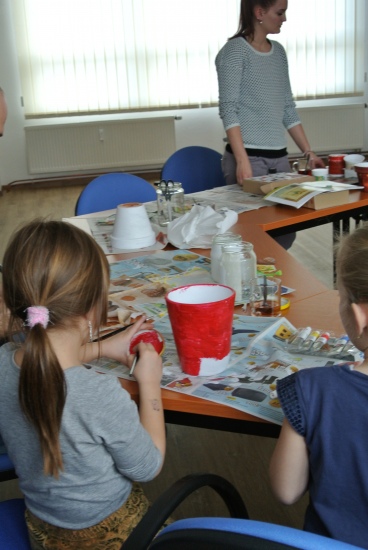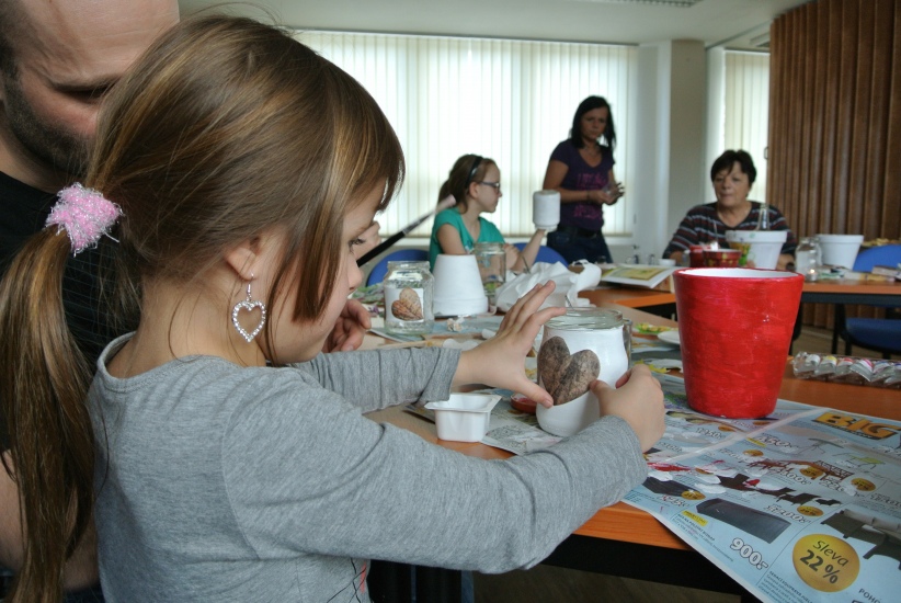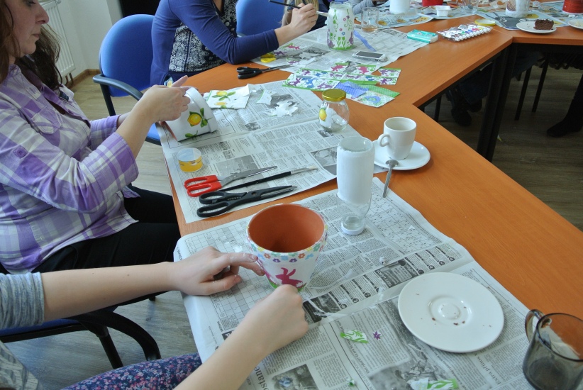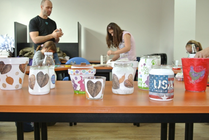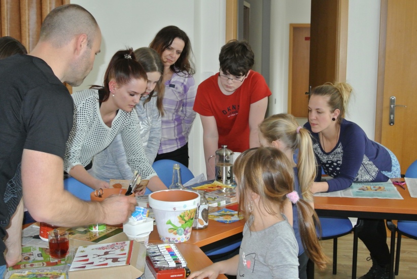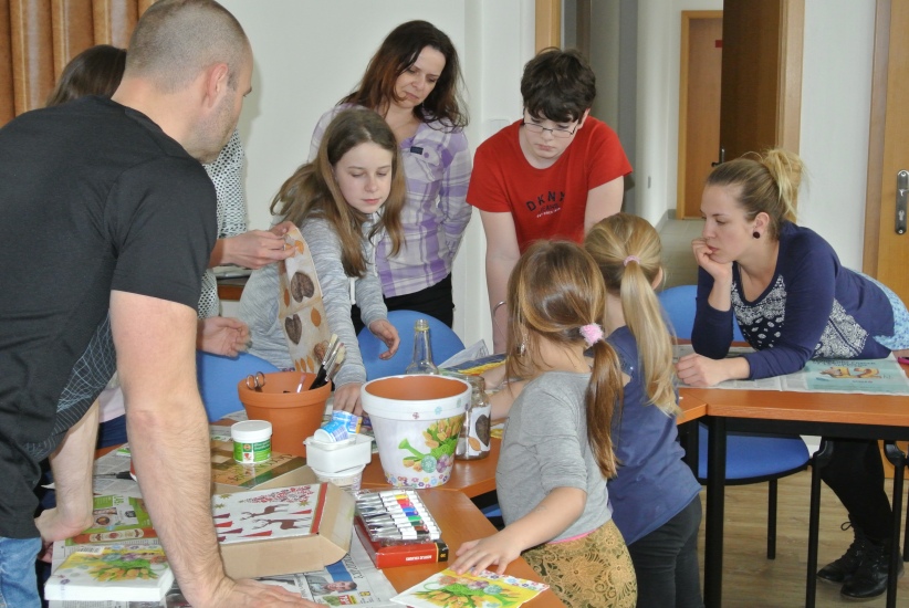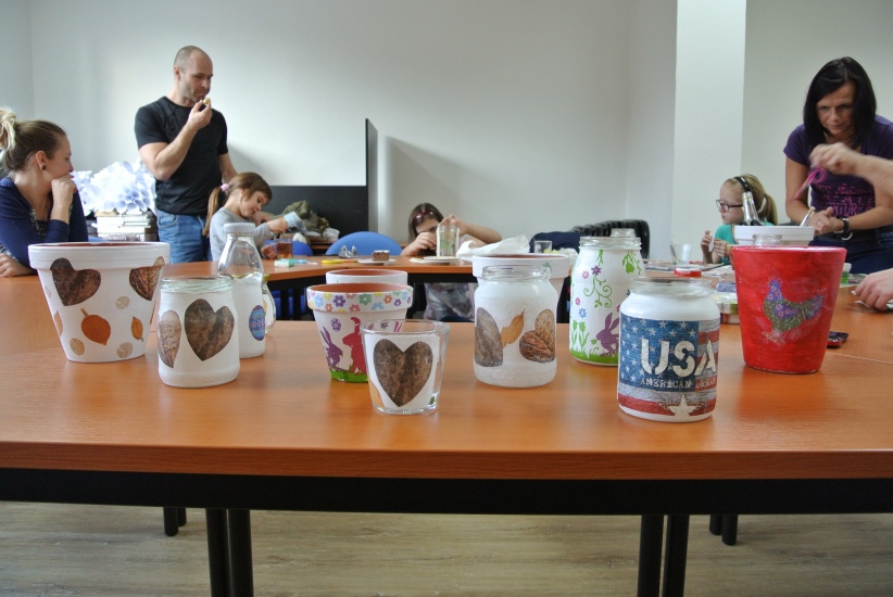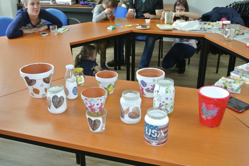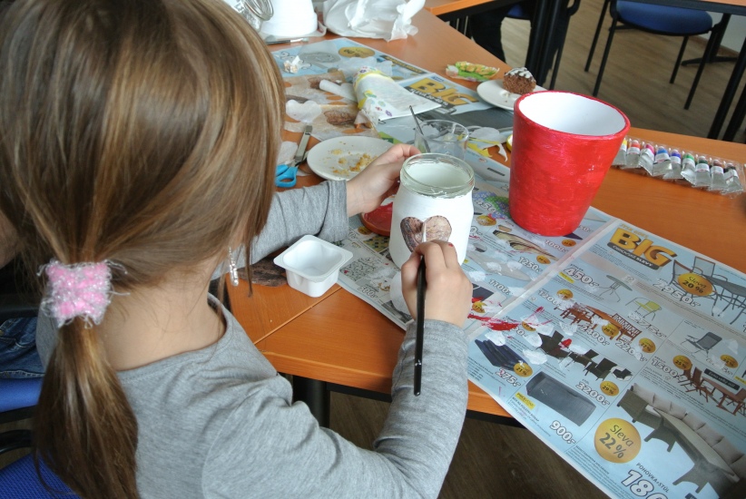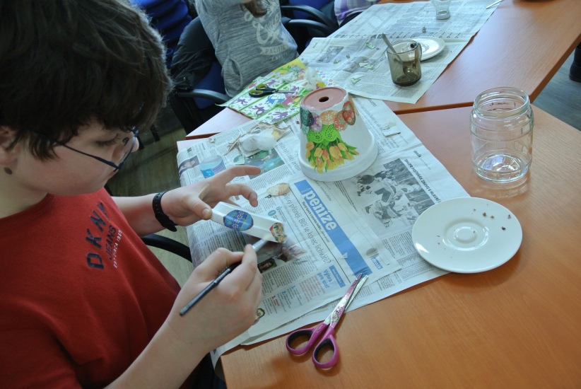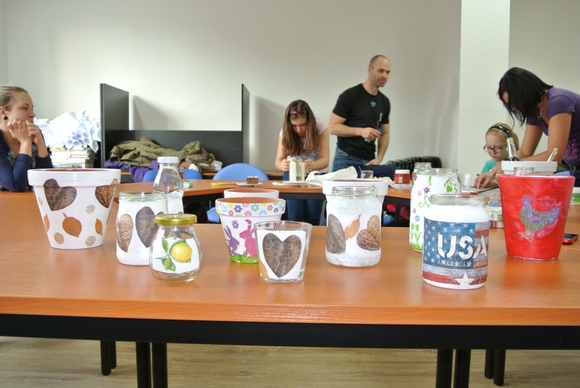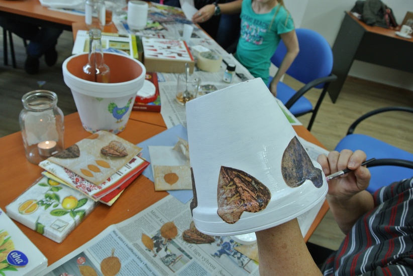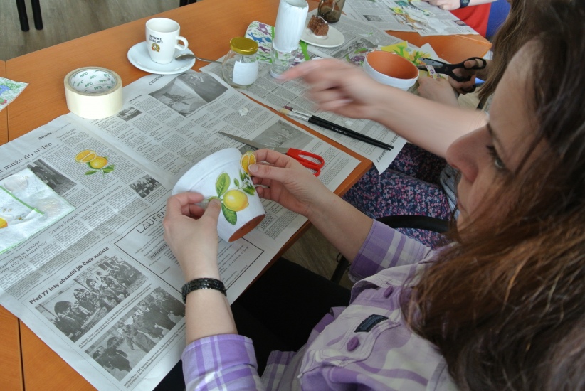Ve středu 16. března jsme si s Helenou Reifovou poprvé v rámci našich dílniček vyzkoušeli zdobení tzv. ubrouskovou technikou, známou i pod názvem decoupage. Pod rukama účastníků vznikaly z obyčejných květináčů a sklenic krásné nádoby, jak si můžete prohlédnout na fotografiích.